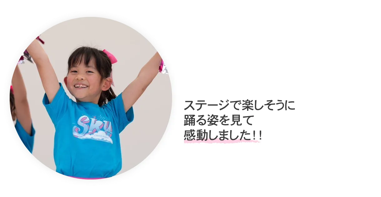 保育園の時からお世話になっていたので、大好きな先生からそのまま習いたいと入会しました。男の子1人ですが、チアダンス自体はとても楽しいと嬉しそうに通っています。発表の場もたくさん作っていただき、ステージ体験もうれしくて仕方ないようで、毎回「楽しかった〜!」と満足そうです。